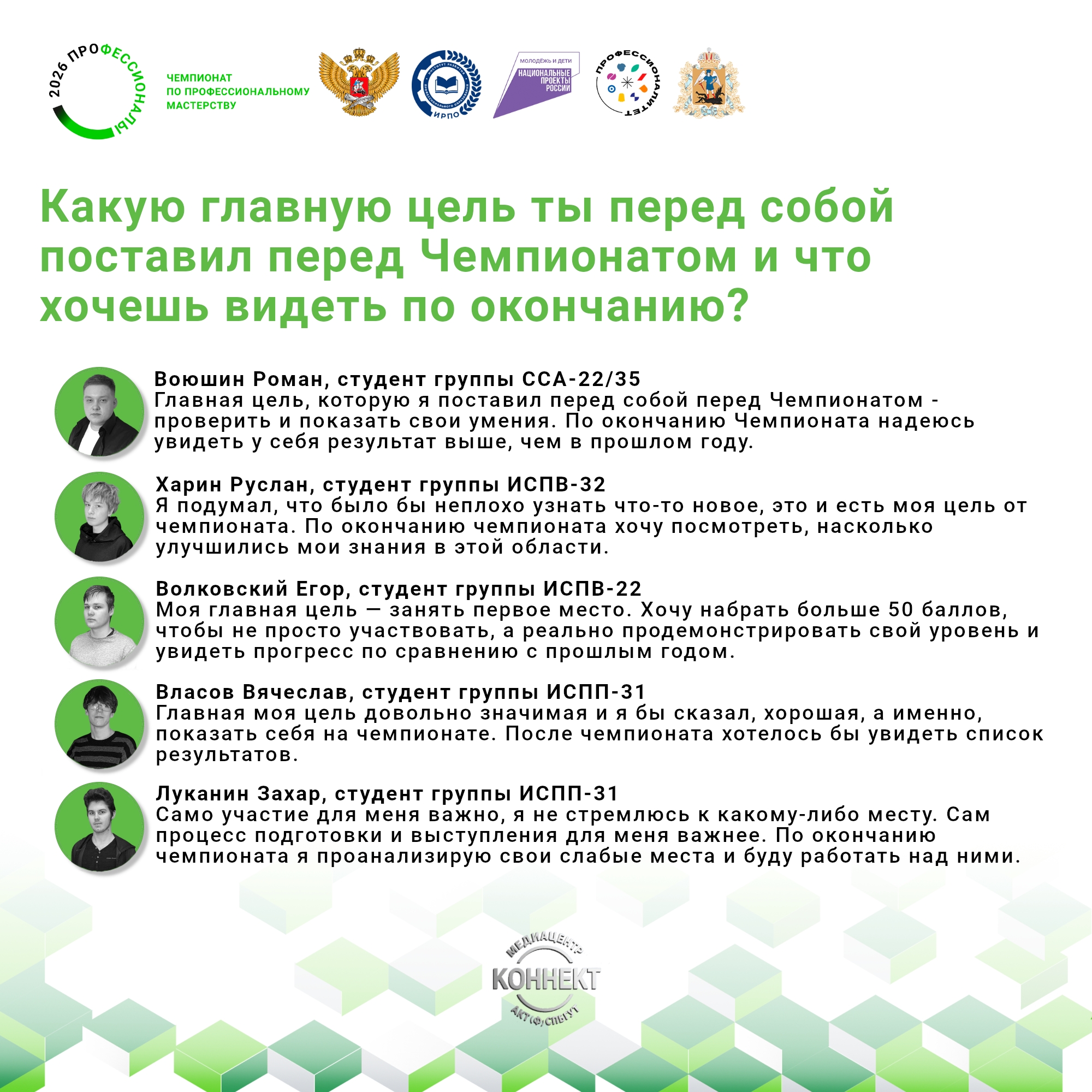 Канал в MAXПочему решили принять участие в Чемпионате? Какую компетенцию выбрали и почему? Какую главную цель перед собой поставили и что хотят видеть по окончанию?