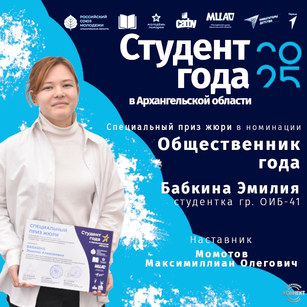 Группа ВКонтактеСтудентка нашего колледжа – призёр конкурса «Студент года – 2025» Архангельской области!