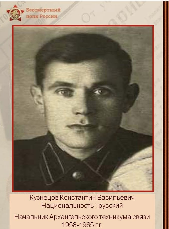 Одним из защитник Ленинграда был начальник Архангельского техникума связи в 1958-1965 г.г. Кузнецов Константин Васильевич, русский. Константин Кузнецов в конце 30-х годов приехал учиться в Архангельский техникум связи из Тотьмы Вологодской области. В январе 1940 года, будучи студентом, он был призван на советско-финскую войну 1939-1940 годов. Красной Армии нужны были военнослужащие в подготовкой в области радиосвязи, т.к. именно во время этой войны нашей армией были впервые применены в боевых условиях радиолокационные станции для обнаружения самолётов противника. Участие красноармейца Кузнецова в войне было недолгим, в марте 1940 года СССР и Финляндия заключили мирный договор. Константин смог вернуться к учебе в техникуме. В 1940 году после окончания техникума с отличием остался в нем преподавать.