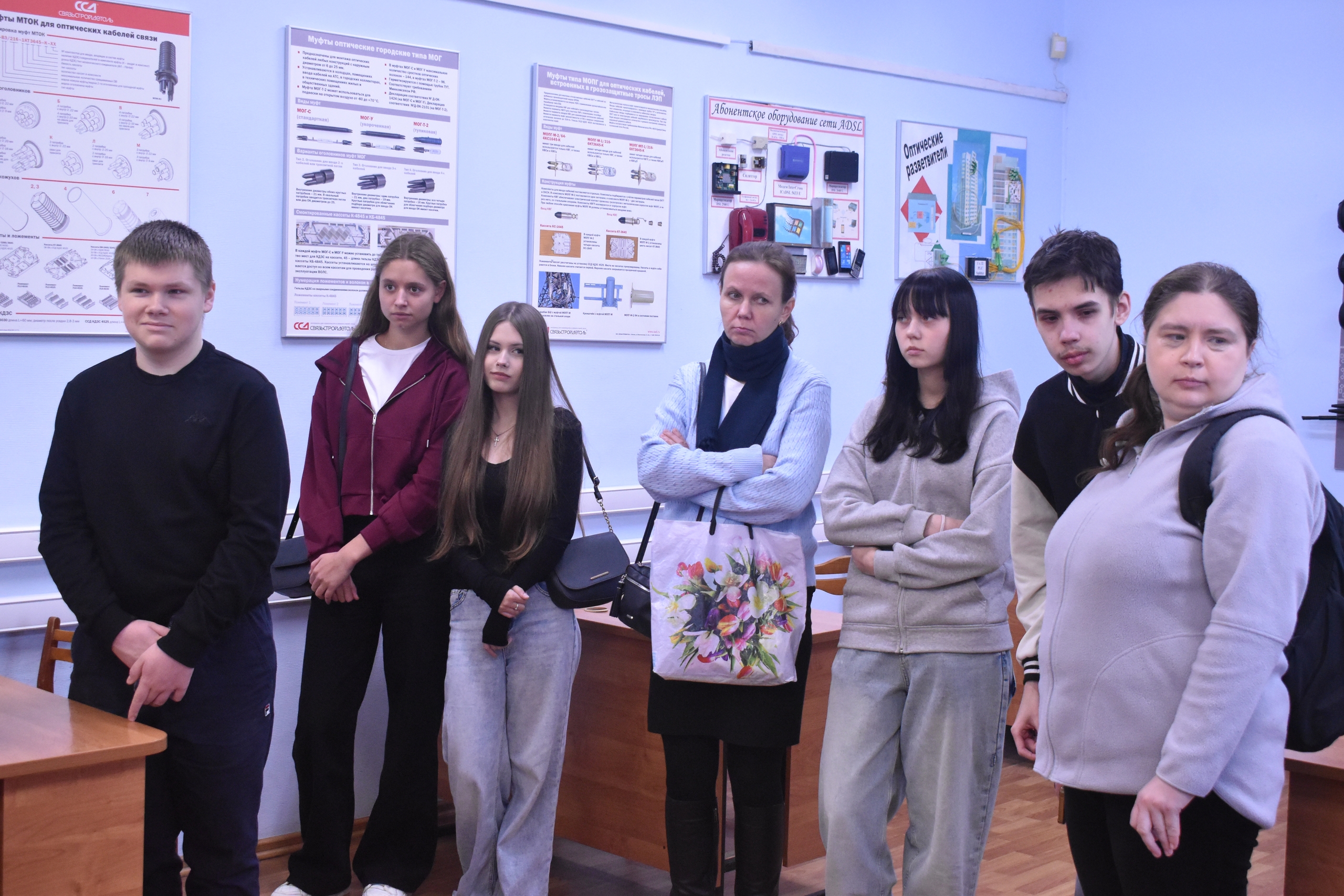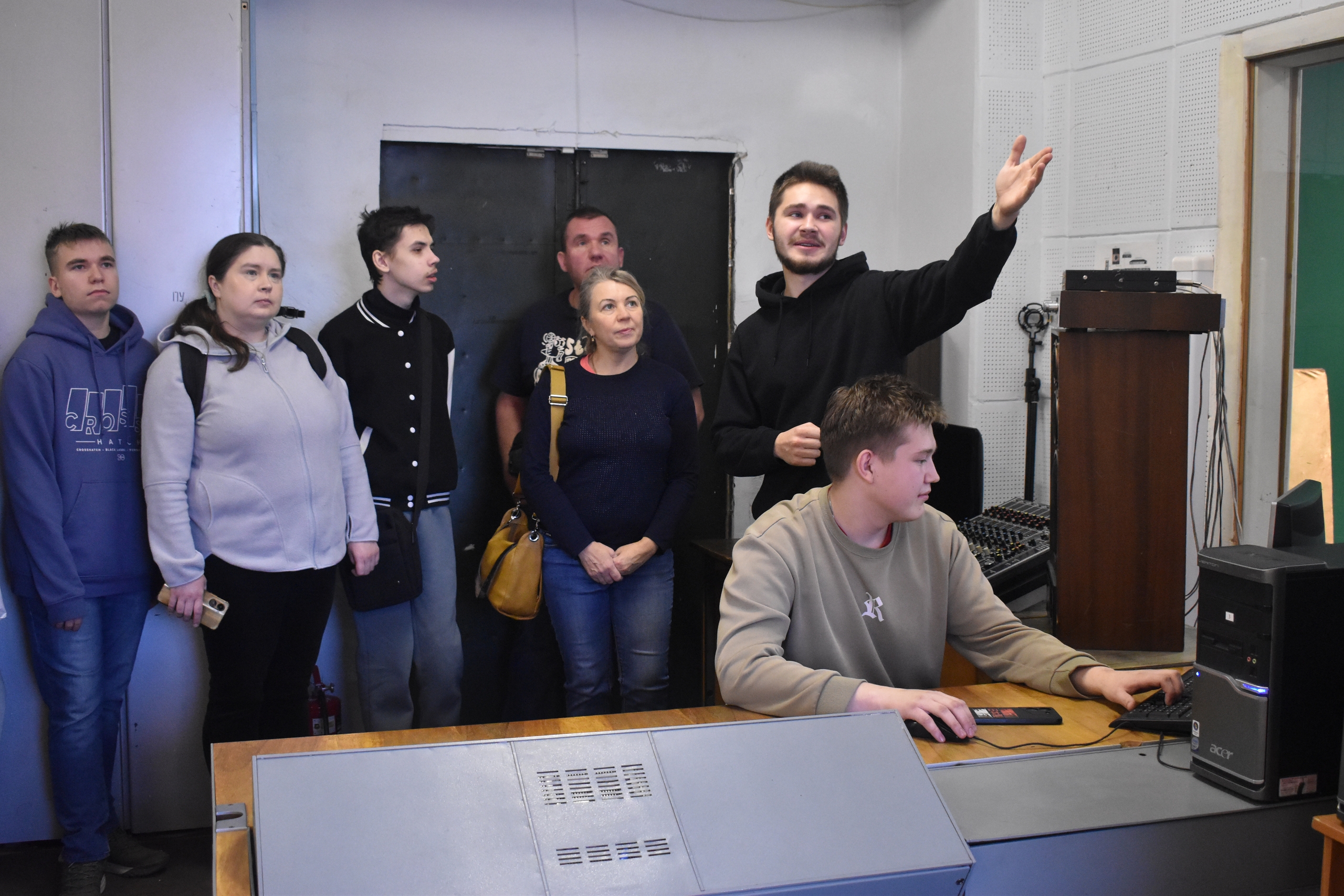 Экскурсия по лаборатории телевизионного вещания, где студенты 2-го курса специальности "Системы радиосвязи, мобильной связи и телерадиовещания" Петухов Кирилл и Кузнецов Юрий продемонстрировали принципы формирования телевизионного сигнала, позволив каждому участнику увидеть себя в прямом эфире студии.