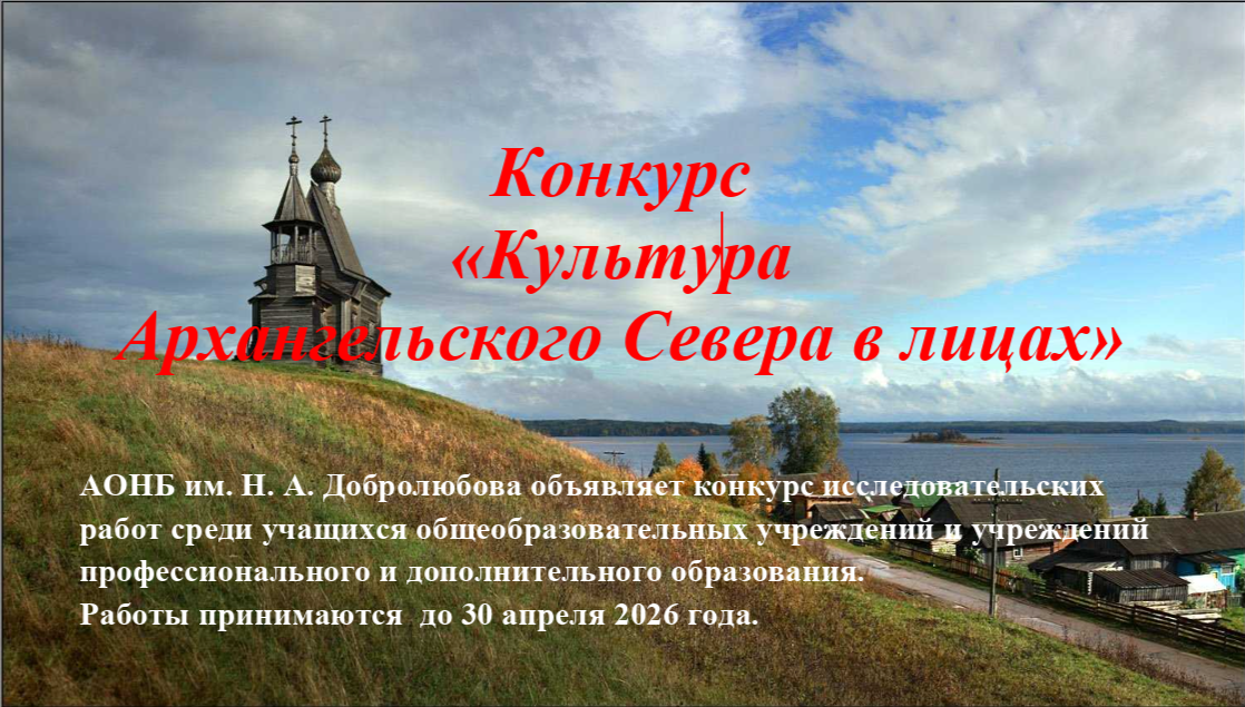 Канал в MAXАОНБ им. Н. А. Добролюбова объявляет конкурс исследовательских работ «Культура Архангельского Севера в лицах» среди учащихся общеобразовательных учреждений и учреждений профессионального и дополнительного образования.