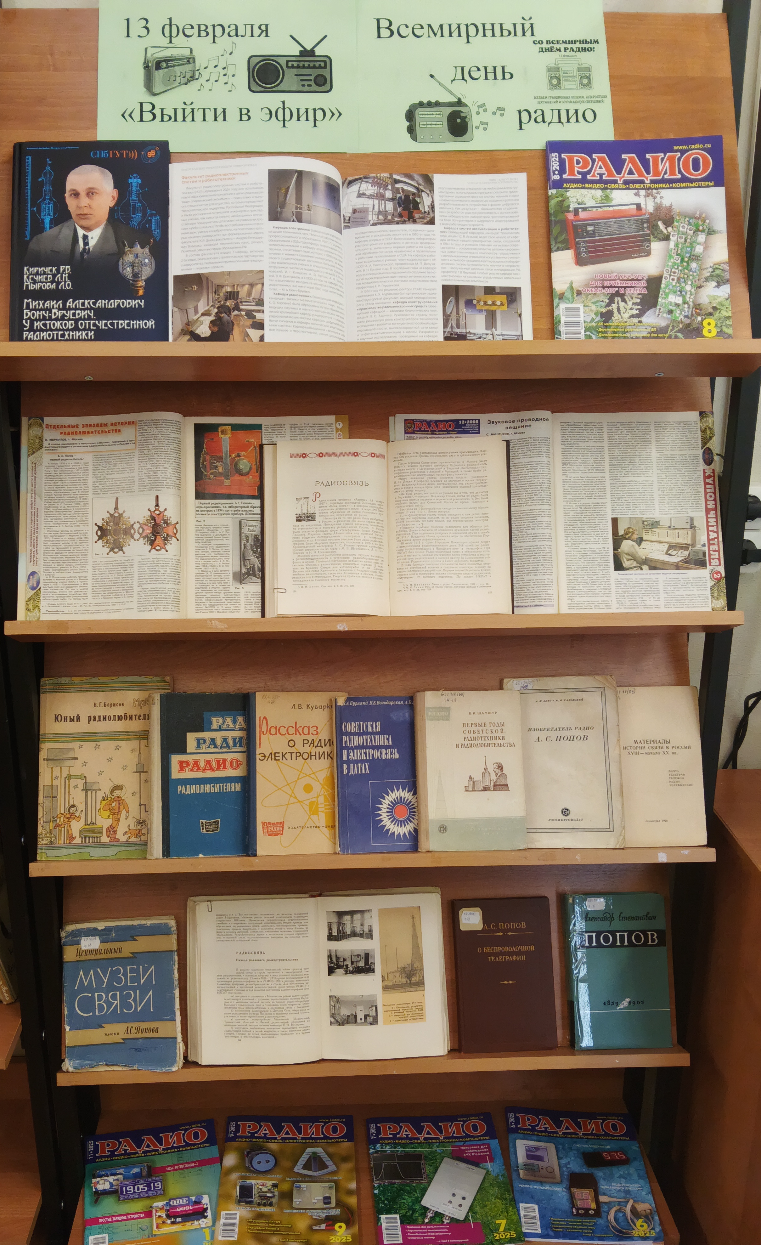 На выставке представлены книги и выпуски журнала «Радио», а также труды основоположников отечественной радиопромышленности, таких как А.С. Попов, М.А. Бонч-Бруевич. Особенно хочется отметить юбилейное издание, выпущенное к 95-летию СПбГУТ, на страницах которого опубликована информация о факультете радиоэлектронных систем и робототехники.