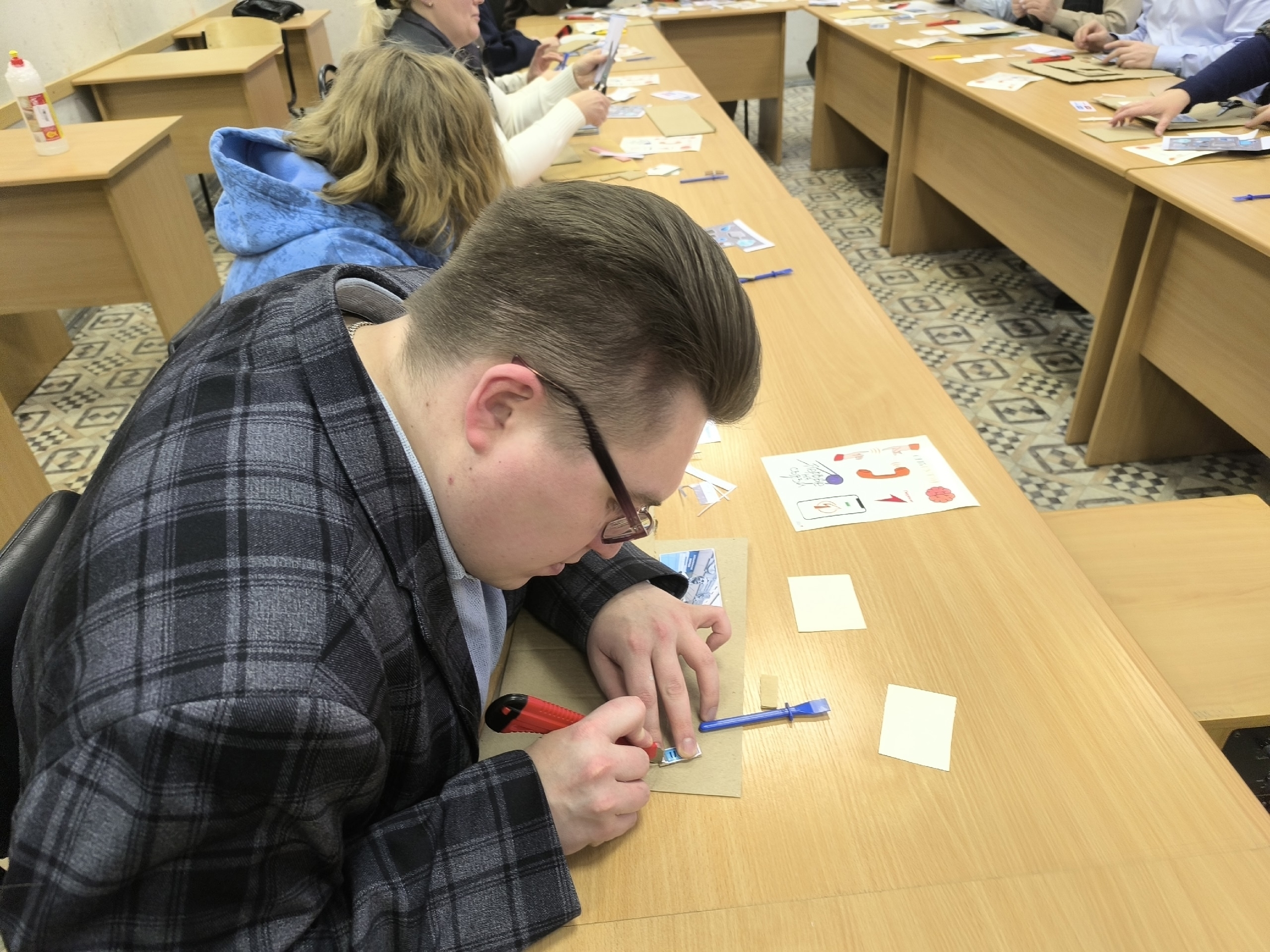 Мы заранее собрали картонные коробки, подготовили клей, фото колледжа, магнитики и инструкции.