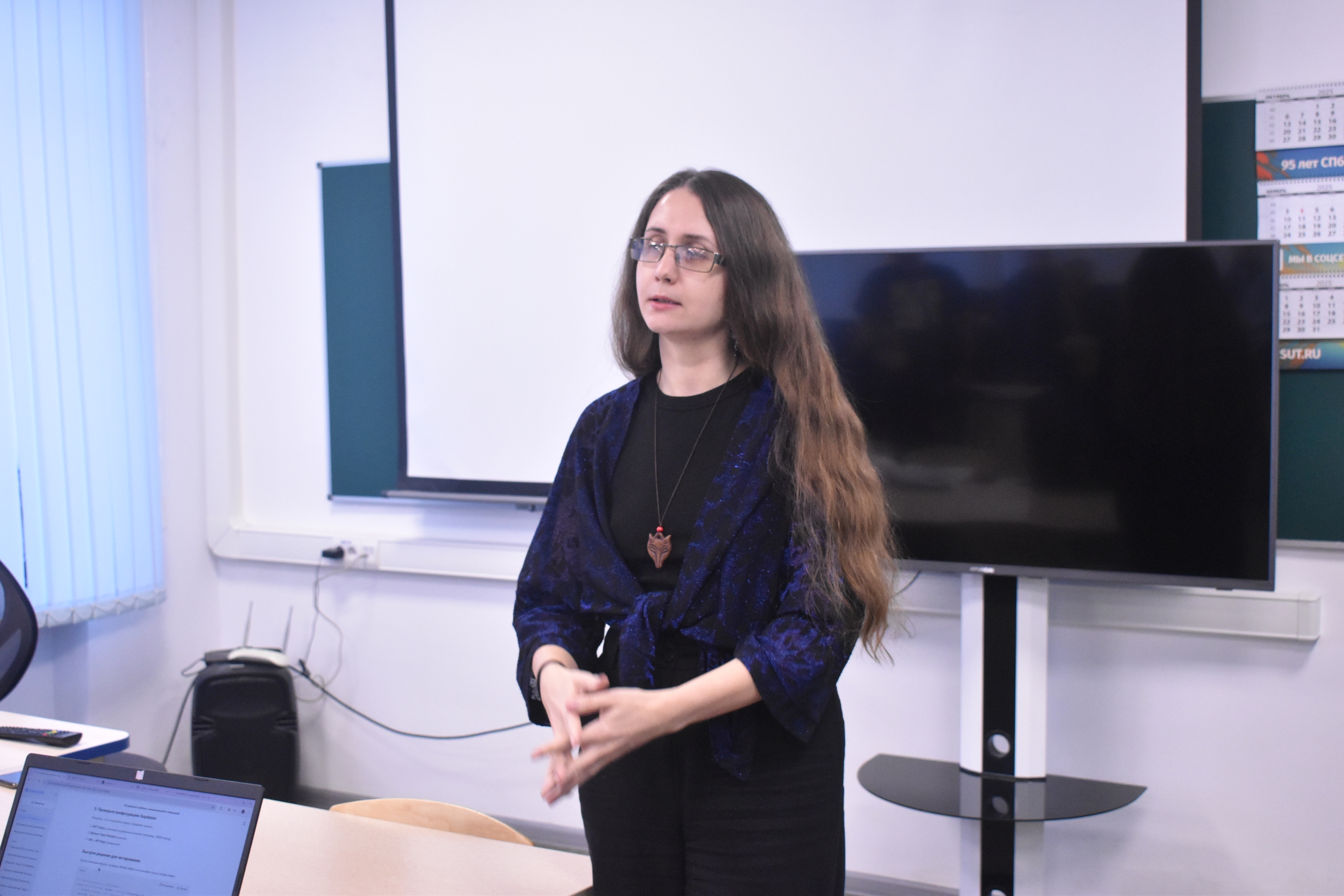 Экскурсия по лаборатории телевизионного вещания, где студенты 2-го курса специальности "Системы радиосвязи, мобильной связи и телерадиовещания" Петухов Кирилл и Кузнецов Юрий продемонстрировали принципы формирования телевизионного сигнала, позволив каждому участнику увидеть себя в прямом эфире студии.